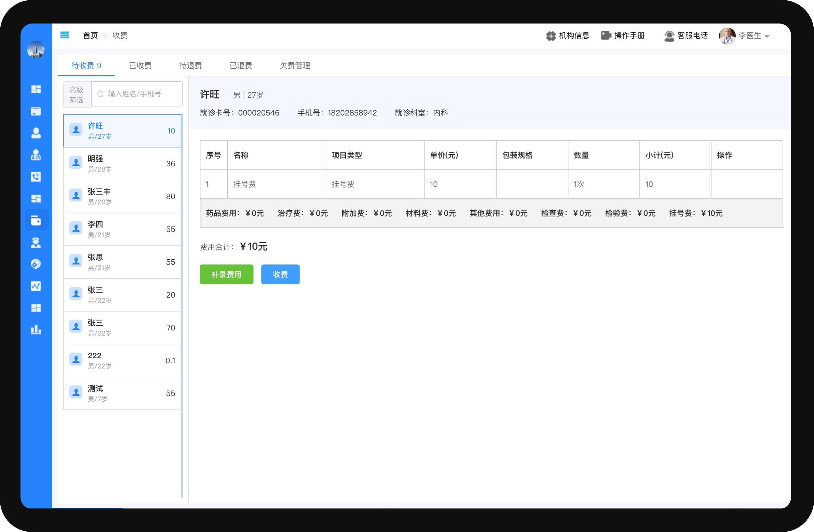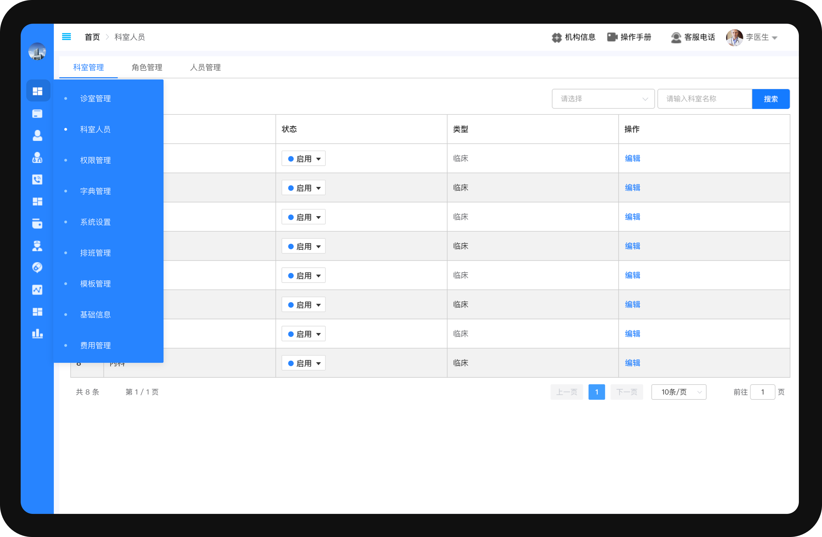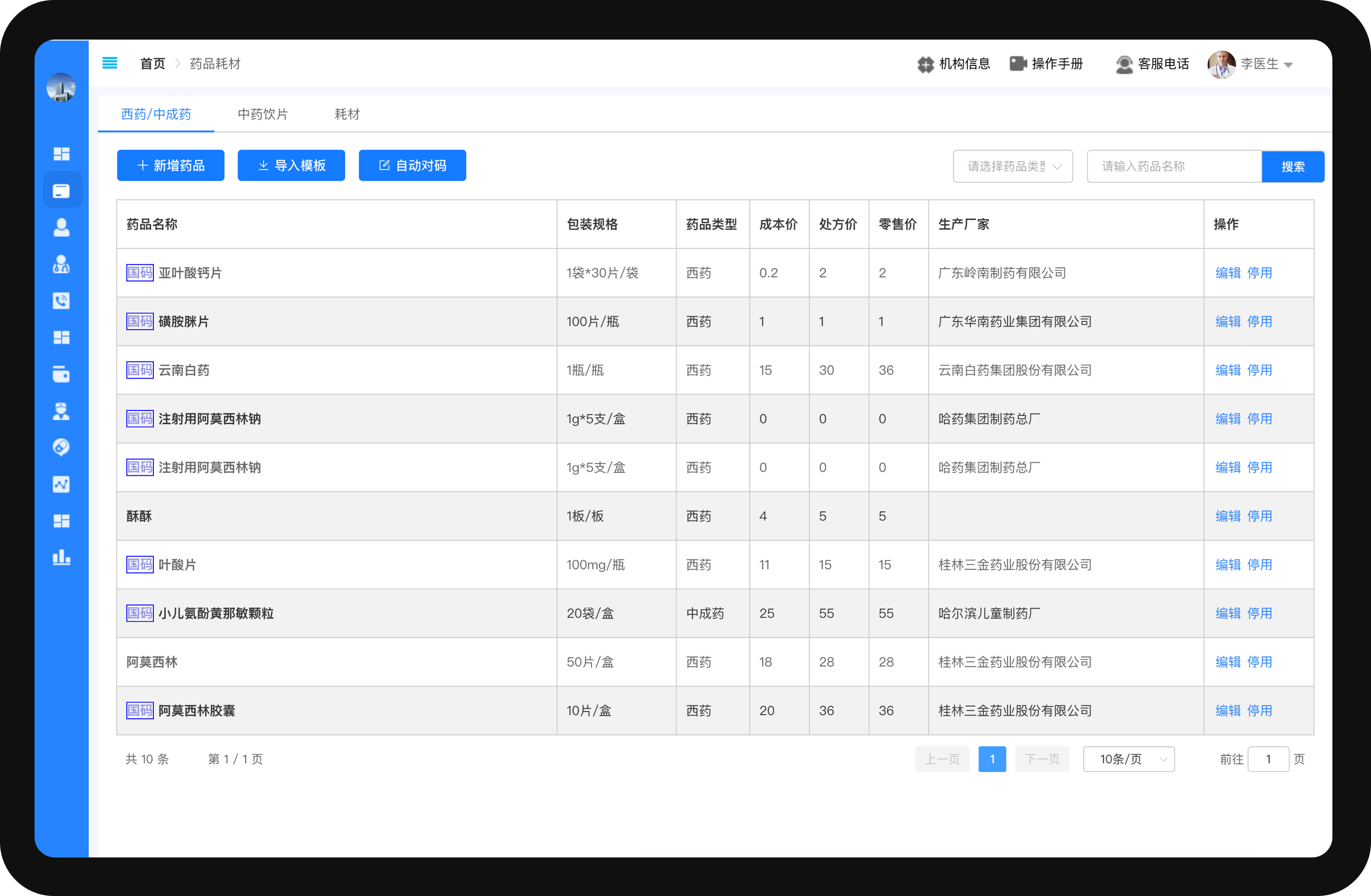 支持挂号、接诊、检查检验、电子处方、电子病历、药品管理、用户管理、经营管理全流程。
