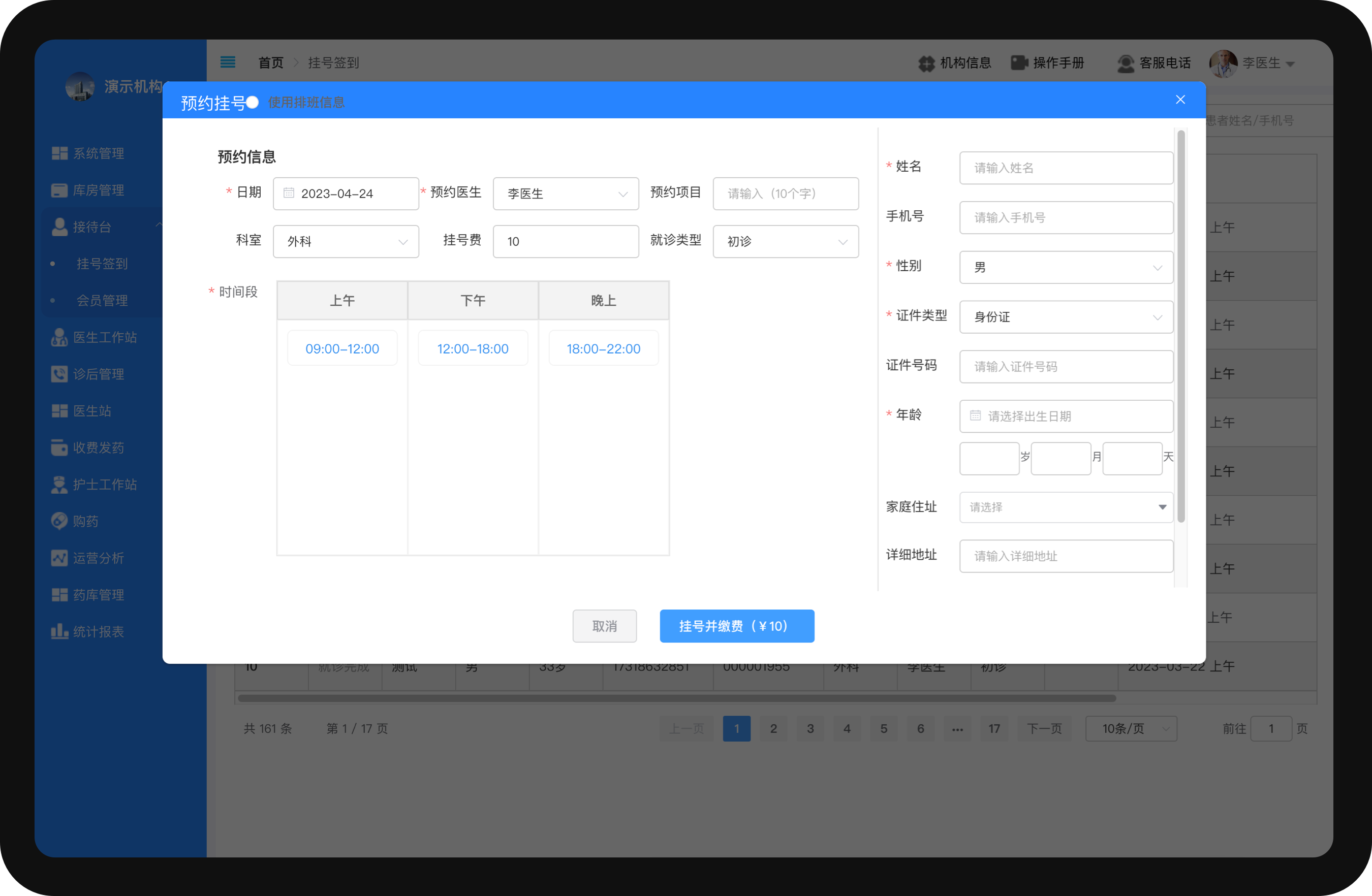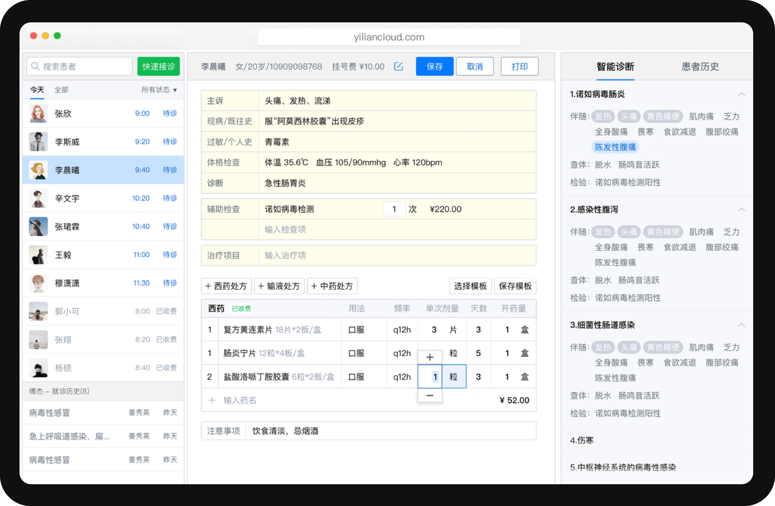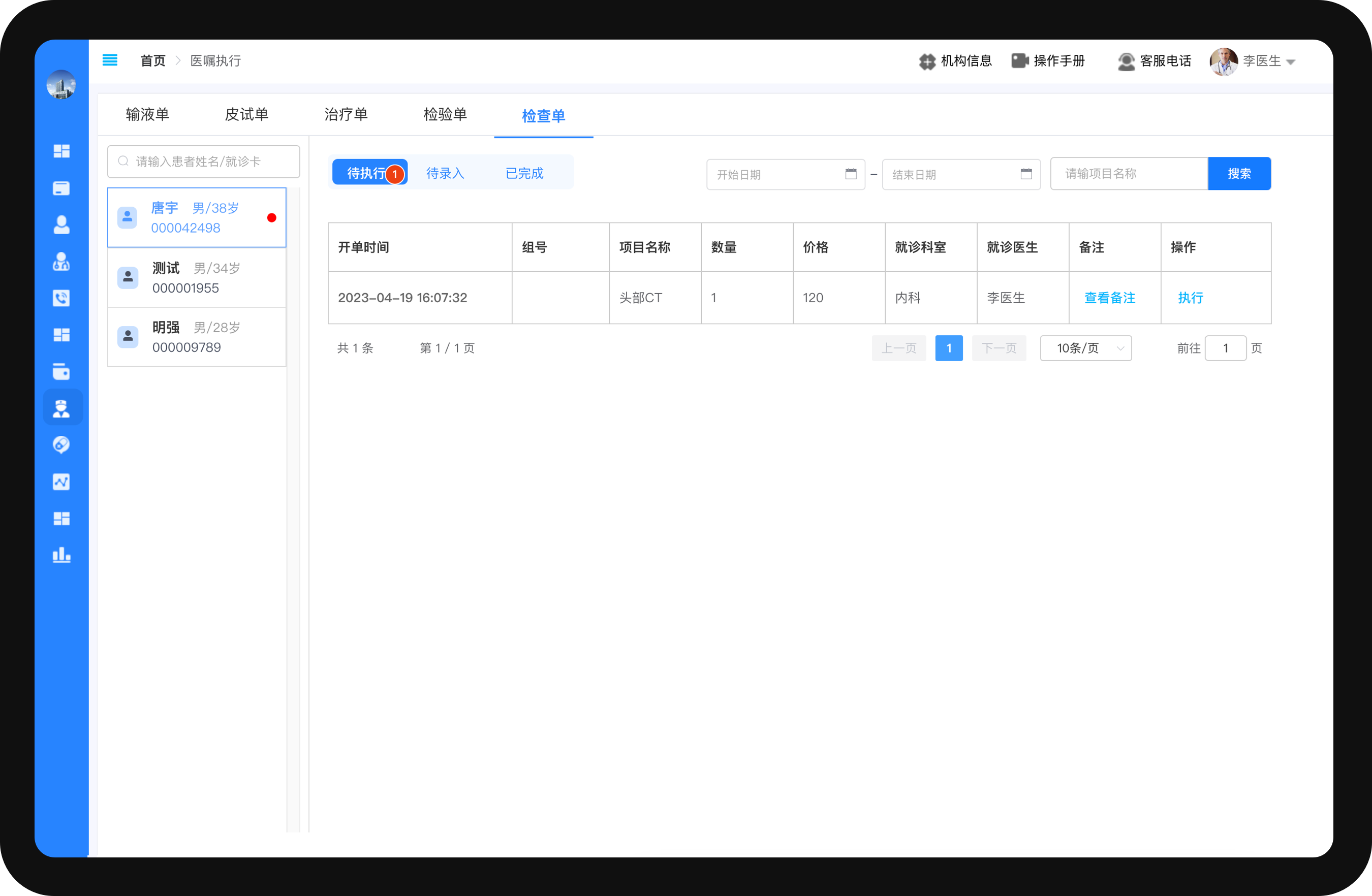 支持挂号、接诊、检查检验、电子处方、电子病历、药品管理、用户管理、经营管理全流程。
