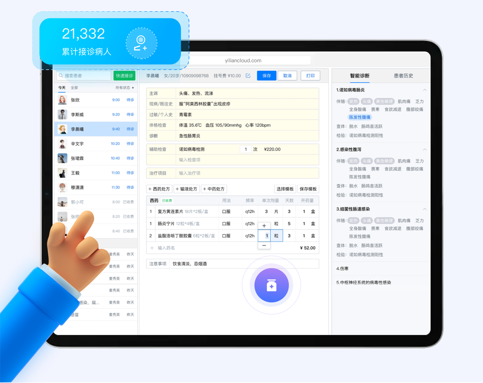 AI辅助决策模块帮助提升诊所的医疗水平和服务质量,CRM模块帮助诊所管理和运营患者客户。
