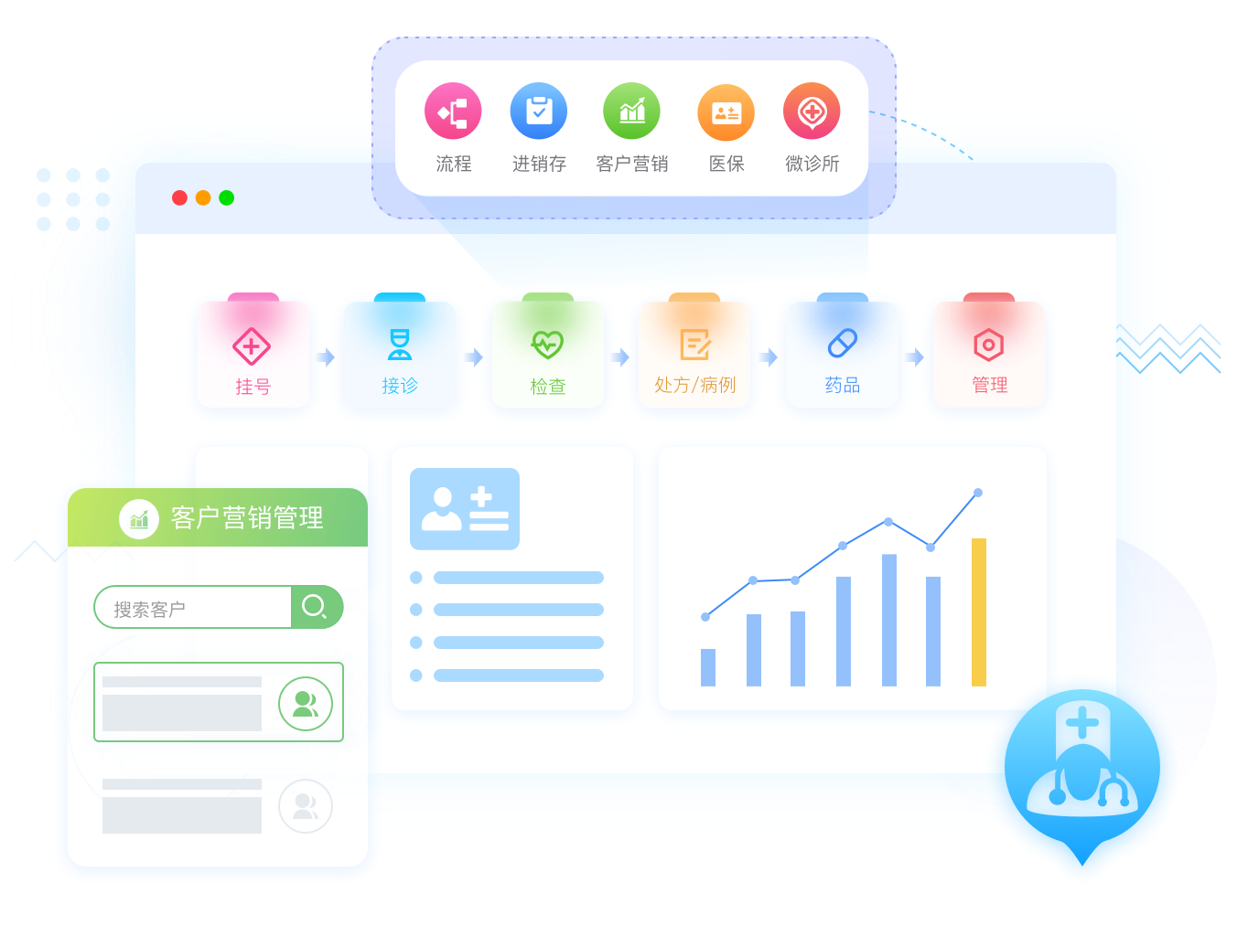 医链云包括诊所流程管理、进销存管理、客户营销管理、医保管理、微诊所等功能模块,覆盖诊所经营的所有业务,助力诊所数字化管理。