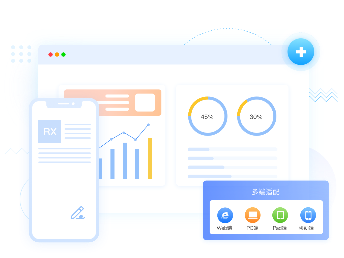 医链云支持多设备终端使用,包括Web端、PC端、Pad端、移动端,全面覆盖诊所人员的使用方式,满足不同场景的使用需求。