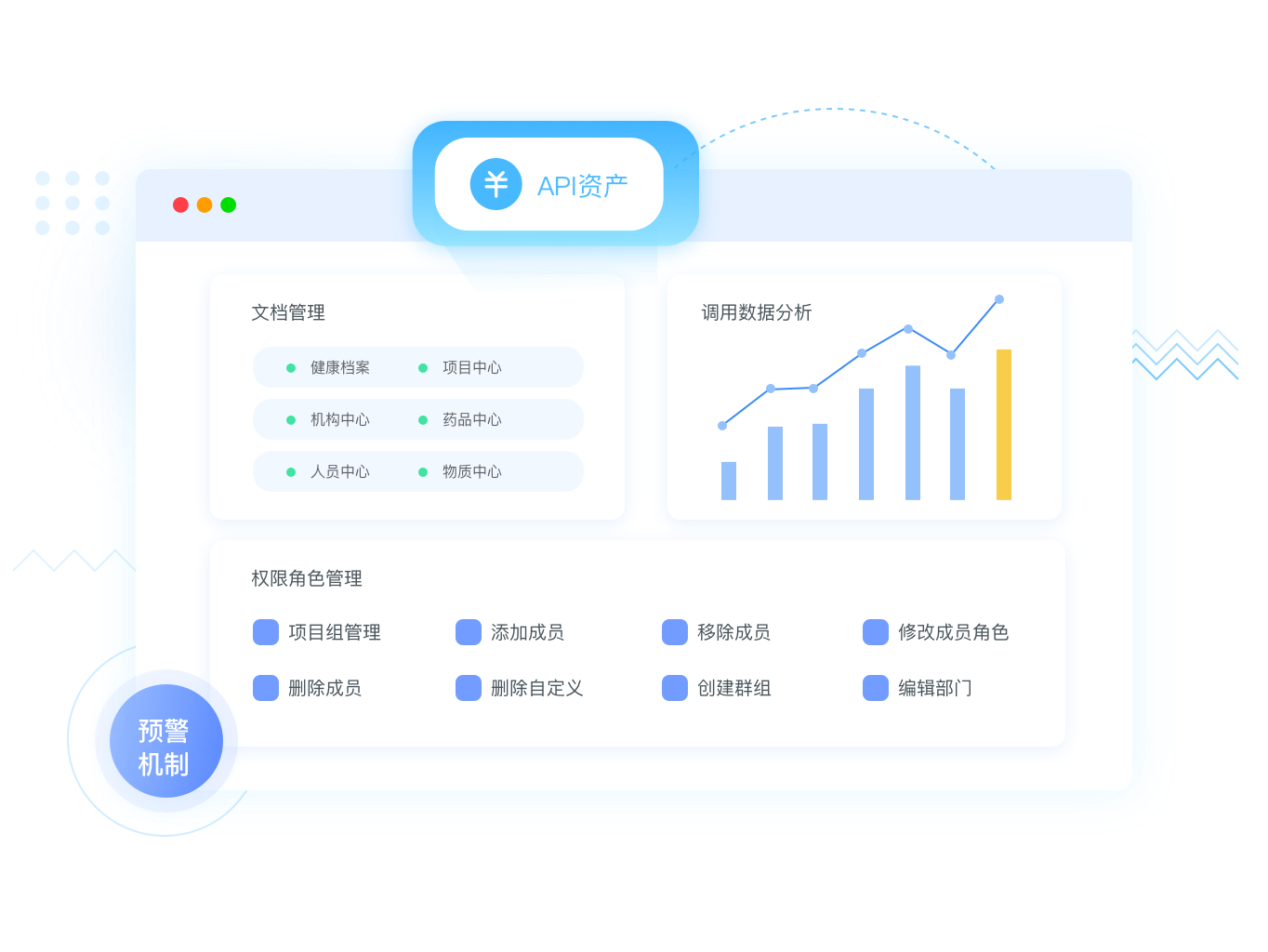 全面管控医院的API资产,梳理现有业务系统的API。实现API文档的统一管理,建立API的上线、下线、监控的统一管理体系及标准规范。建立API的预警机制,调用数据分析,权限角色管理等。