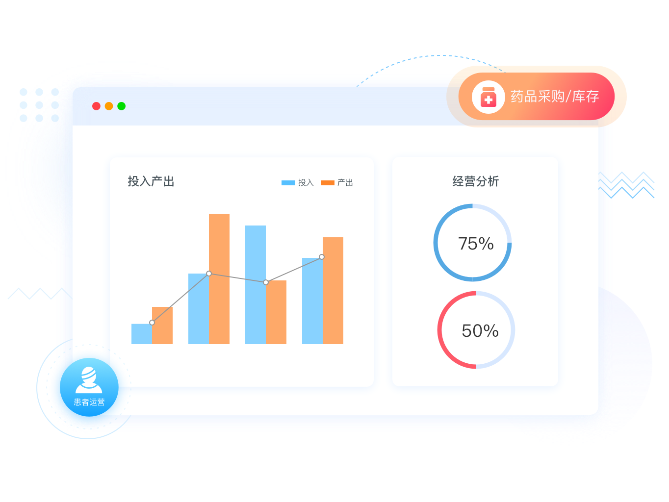 全局管理诊所经营流程,站在上帝视角关注经营的投入产出情况,实现药品物资的采购和库存智慧化管理,患者运营和营销管理,经营数据的统计和分析,让诊所管理者明明白白经营诊所。