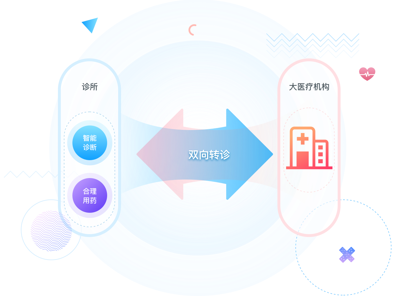 帮助诊所对接先进的诊疗工具提升诊所诊疗能力,如:智能诊断、合理用药等工具。帮助诊所接入基础的医疗设备,让诊所能够实现基础的检验检查。帮助诊所整合医疗资源,实现诊所与大医疗机构的双向转诊。